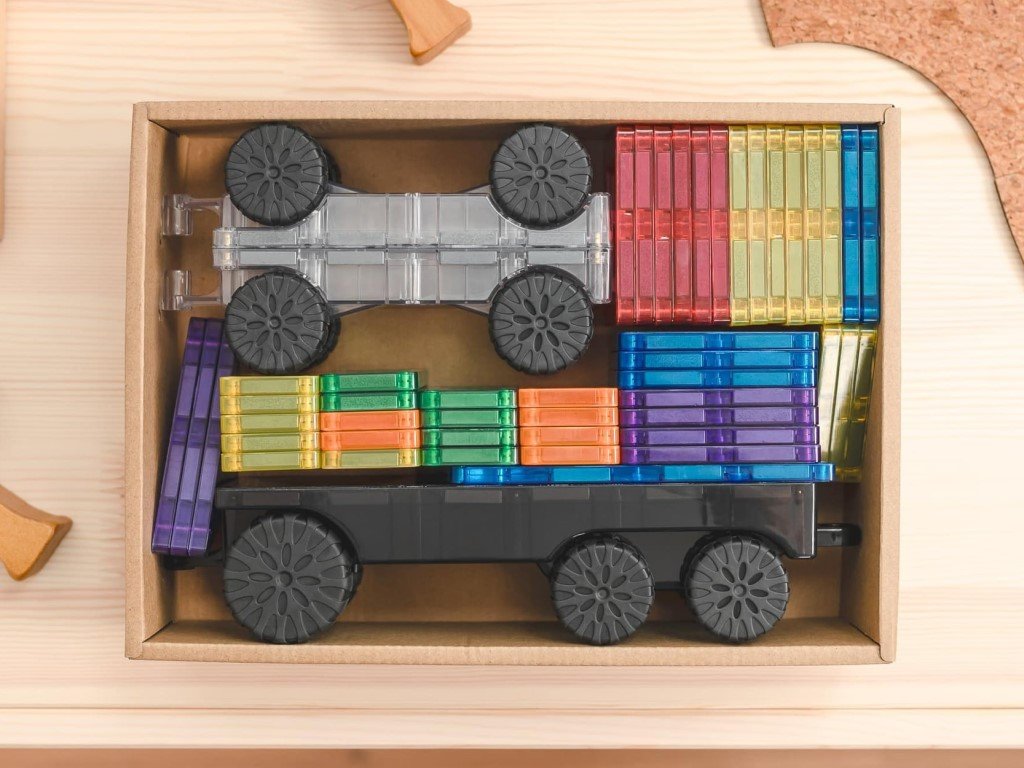 Magnetická stavebnice s díly pro stavbu aut a přívěsů v překrásných duhových barvách podpoří hodiny neomezené kreativity, zábavy a učení prostřednictvím příjemného hraní. Postará se o rozvoj jemné a hrubé motoriky, zvýší schopnost soustředit se, představivost a trpělivost. Sledujte, jak děti vytváří auta, nákladní vozidla i přívěsy. Ať už stavíte samostatně nebo s přáteli a rodinou bude to vždy skvěle strávený čas.