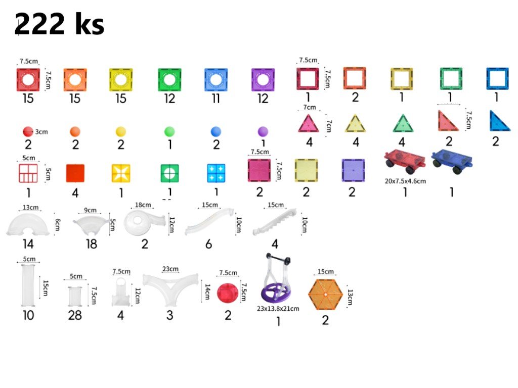 - Rozměry dílků: čtverec malý 7,5 x 7,5 cm, trojúhelník rovnostranný 7 x 7 cm, trojúhelník pravoúhlý 7,5 x 7,5 cm, podvozek 4,6 x 20 x 7,5 cm (rozměry najdete v galerii fotografií).