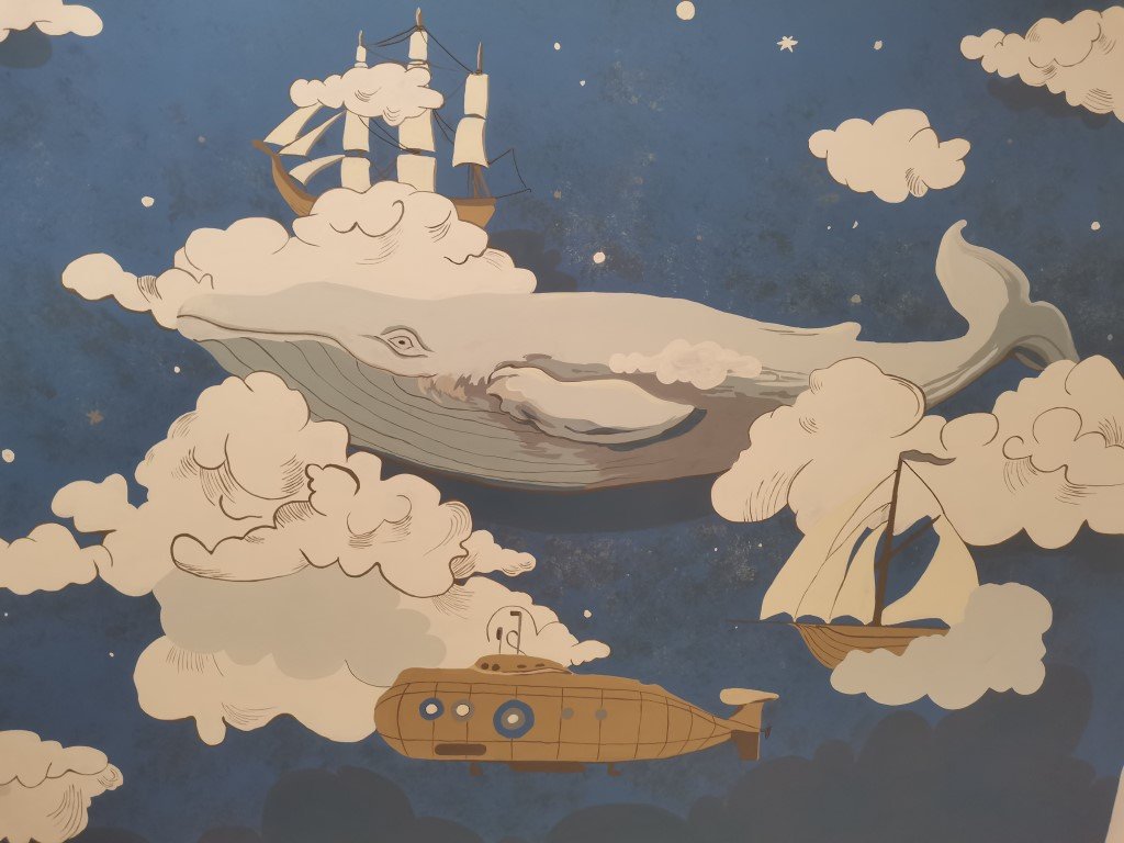Mají vaše děti sny plné fantazie, ve kterých se promítají jejich tajné sny a přání? Kdo z nás někdy nesnil o tom umět létat? Stačí se ponořit do sladkého snění nebo se podívat na strop v dětském pokoji a rázem se ocitnete v říši snů. V říši, ve které je vše možné, kde mohou létat lodě, ponorky a dokonce i velryby. Příjemná modrá barva a něžné motivy působí relaxačně a vnesou do dětského pokojíčku pocit klidu a harmonie. Aby se námořníci ve vznášejících se korábech neztratili, naviguje je při plavbě říší snů maják. Zářící hvězdy, měsíc v úplňku a mráčky plující oblohou dotváří relaxační nádech celé ručně malované noční oblohy.