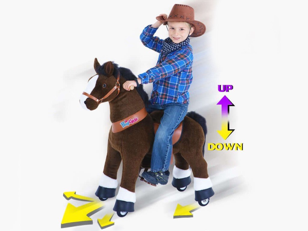 Miluje vaše holčička nebo váš chlapec koníky, poníky a sní o tom, mít jednoho i doma, ideálně ve svém dětském pokoji? Pak pro něj bude tento kůň s čokoládovou srstí, bílou lysinou, černou hřívou a oháňkou splněným snem. S heboučkým koníkem si může hrát, mazlit se a dokonce na něm i jezdi. Tmavě hnědý kůň s hnědým sedlem a ohlávkou, s pohodlným vyvýšeným sedlem, hebkou srstí, protiskluzovými pedály, dřevěnými rukojetěmi a ruční brzdou vaše dítko povozí na svém hřbetě a ukáže mu, že nejlepší pohled na svět je právě z tohoto místa. Na koníkovi na kolečkách se děti mohou povozit doma i venku. Po stisknutí tlačítka kůň vydává realistické zvuky - řehtá nebo vydává zvuky klapajících kopyt. Vybírat můžete ze 3 velikostí dle věku a hmotnosti dítěte.