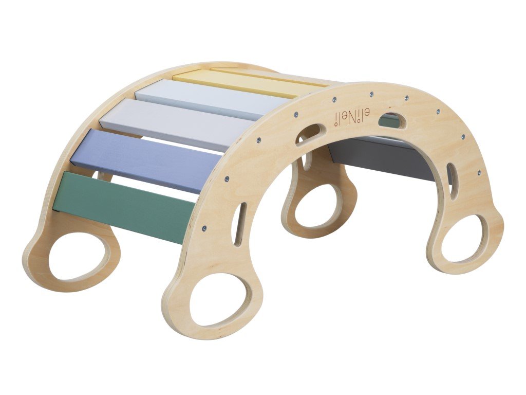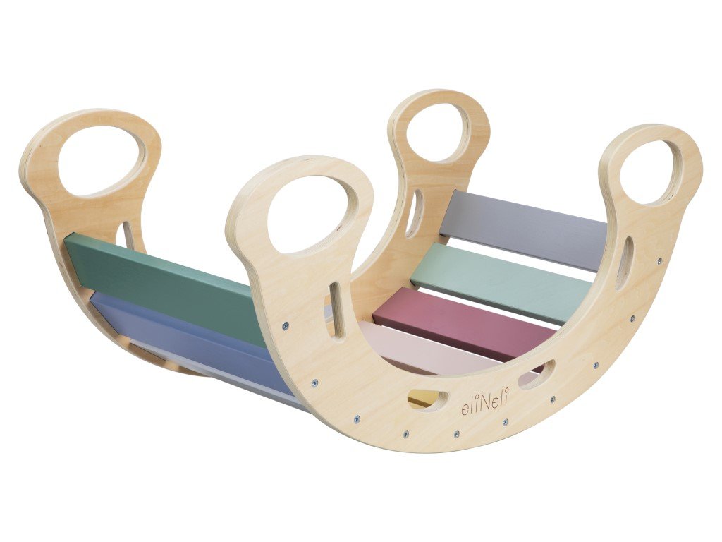 - Neutrální pastelové barvy - houpačka s duhovými deskami i oboustranné prkno s duhovými úchyty jsou vhodné pro holčičky i kluky.