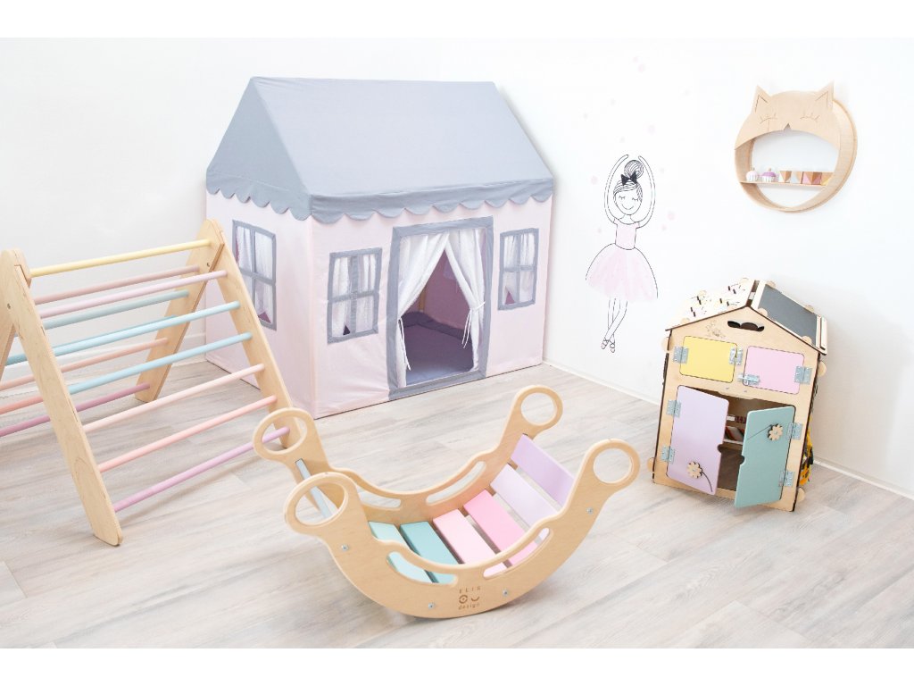 Montessori houpačku 5v1 můžete propojit s Piklerové trojúhelníkem, případně přidat bazének s míčky, a vytvořit tak kousek hřiště uprostřed pokojíčku.