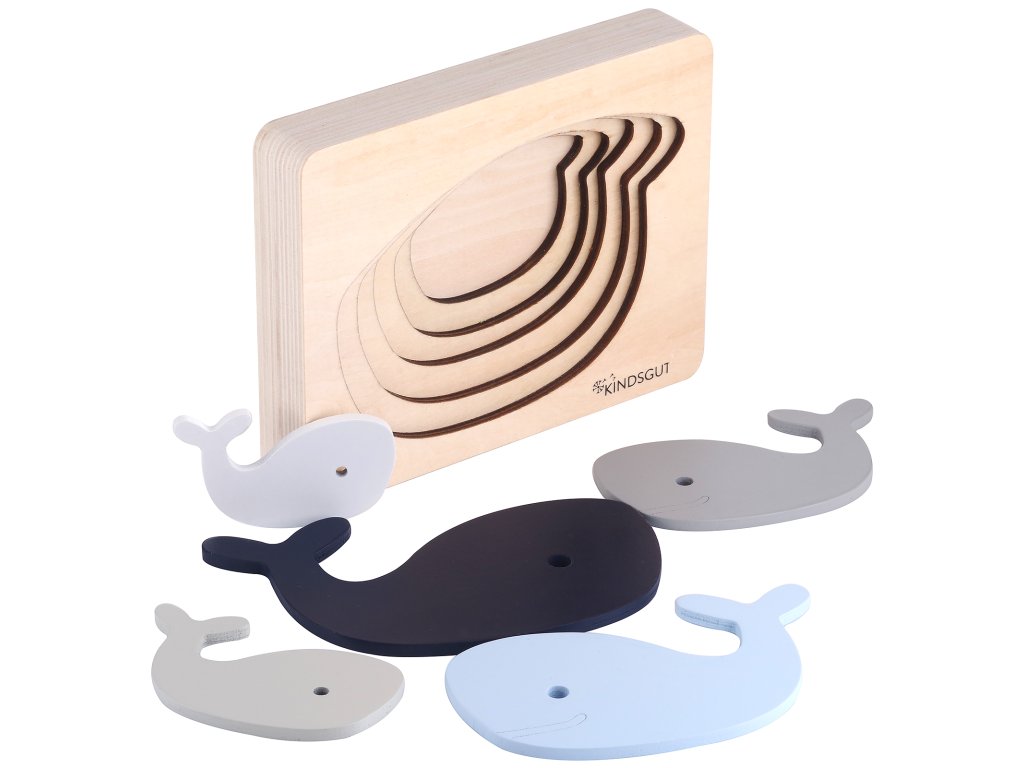 je velice skladné, proto se hodí i na cestování. Dřevěný materiál a zdravotní nezávadnost barev zaručuje německá firma s dlouholetou tradicí. Ekologický materiál a okouzlující barevné kombinace jsou výbornou volbou. Dřevěné puzzle obsahuje pět různě velkých velryb a dřevěnou desku, kam se podle velikosti velryby vkládají.