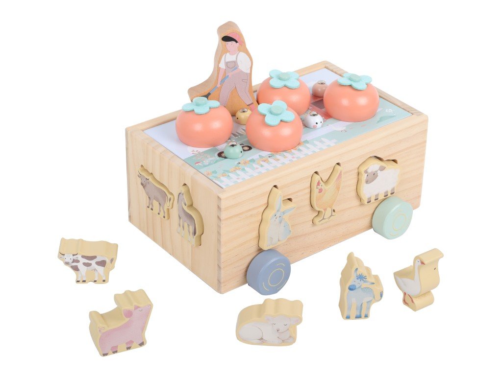 Netradiční zábavu si pro děti připravila originální, multifunkční, pojízdná farma. Tato hračka totiž obsahuje hned 2 vkládačky a magnetickou hru. Vkládačka na boční straně vozíčku má předchystané otvory pro vkládání zvířátek z farmy. Oblíbená zvířátka, která děti mohou vidět ve svém okolí, jsou vyobrazená v jejich skutečné, reálné podobě. Vrchní strana vozíčku představuje malou farmu, políčko, na které farmář pěstuje řepu. Stejně jako zvířátka i řepu mohou děti vkládat do otvorů. Na poli se však rozmnožili hladoví červíci, kteří si na úrodu brousí zoubky. Pomozte farmáři zachránit úrodu! Stačí jej vzít do ruky a pomocí magnetu na spodní straně panáčka červíky z pole vytahat. Při hře s touto multifunkční hračkou děti zdokonalují motorické dovednosti, koordinaci očí a rukou, učí se soustředit se a trpělivosti, poznávat barvičky a zvířátka, která mohou vidět ve svém okolí.