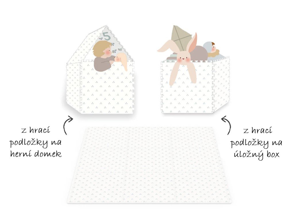 - Multifunkční - skládací hrací podložka složená z pěnových puzzle dílků může být hrací podložkou, úložným boxem na hračky i malým domečkem.