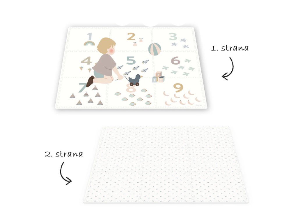 Pěnová hrací podložka 3v1 (multifunkční) složená z 9 pěnových puzzle dílků ochrání děti před chladem při hře na podlaze, dopřeje jim pohodlí a komfort, seznámí je s číslicemi a naučí je počítat do 9. Strana s potiskem v podobě číslic a obrázků v odpovídajícím počtu seznámí děti ze základními počty. Druhá strana hrací podložky je v neutrální bílé barvě s decentním vzorem. Oboustranná hrací podložka je vyrobená ze zdravotně nezávadné pěny EVA, prémiové kvality, vhodné a bezpečné i pro ty nejmenší děti. Pěnové puzzle dílky jsou navíc voděodolné, což oceníte zejména při čištění hrací podložky.