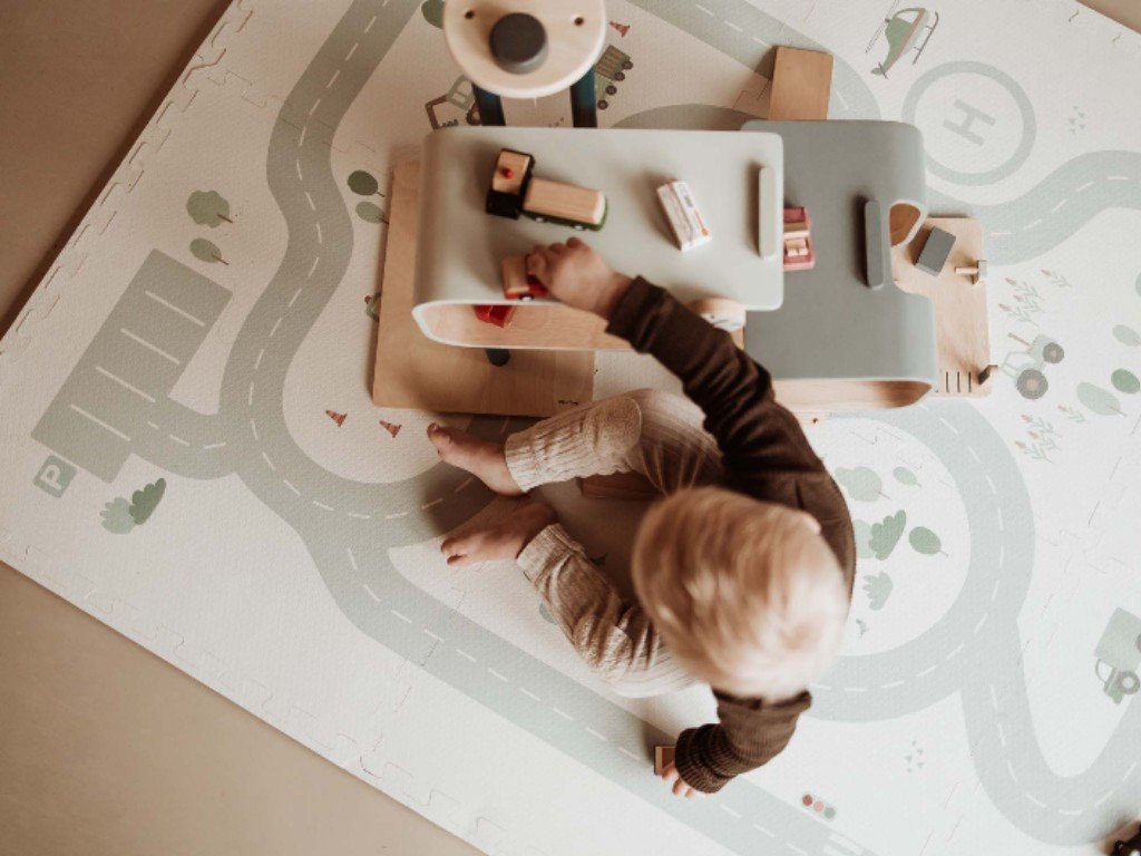 - Zábavný motiv - motiv cesty, domů a přírody podporuje dětskou fantazii a kreativitu, umožňuje dětem pohrát si na podložce s autíčky i dřevěnými kostkami.