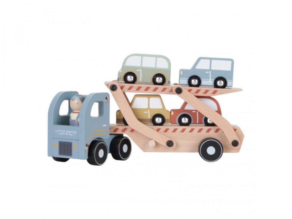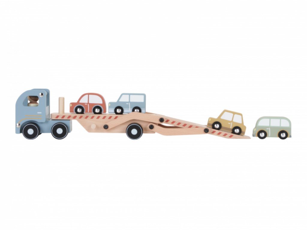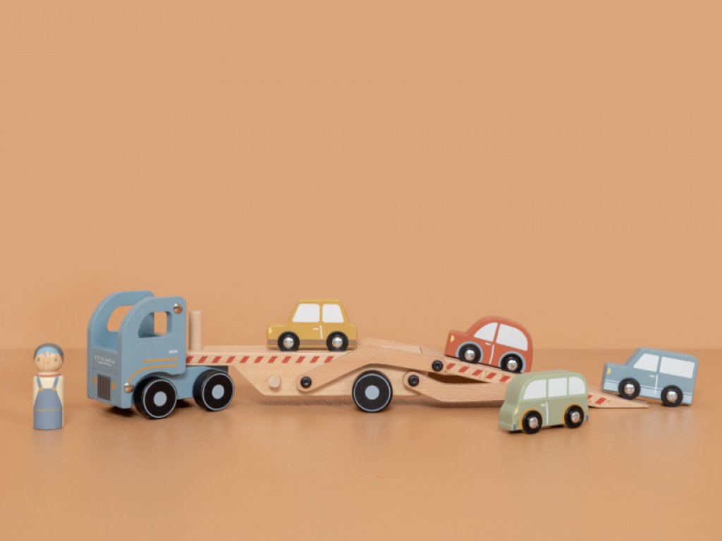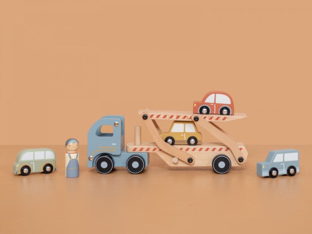 Dřevěný kamion s nákladem čtyř autíček potěší každého malého milovníka aut. Díky sklopné nakládací ploše mohou autíčka snadno najíždět na kamion i sjíždět dolů, což přináší spoustu zábavy a zároveň rozvíjí motorické dovednosti.