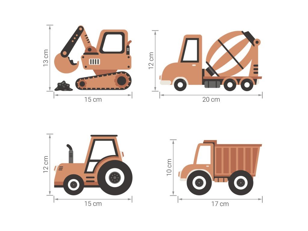 Sada nálepek na zeď se stavebními auty potěší všechny fanoušky těžké stavební techniky. Perfektně vyzdobí každý chlapecký pokoj. V sadě najdete 4 druhy stavebních aut a strojů, které můžete libovolně rozmístit na stěny v dětském pokoji. Budou nákladní auta, traktory, bagry a domíchávače zdobit okolí postýlky, psacího stolu, hracího koutku nebo budou rozmístěné po celém pokojíčku? Fantazii se meze nekladou - oříznutí po obvodu umožňuje individuální rozmístění. Nálepky na zeď jsou opatřeny speciálním matným laminátem, který je chrání před poškrábáním, poškozením a usnadňuje aplikaci na zeď - film je tlustší a snadněji se přenáší na stěnu.