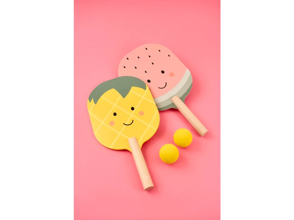 Hraní venku bude ještě zábavnější s tenisovou sadou v barvách letního ovoce.Sada obsahuje dvě dřevěné rakety - jednu ve tvaru ananasu a druhou ve tvaru melounu.
