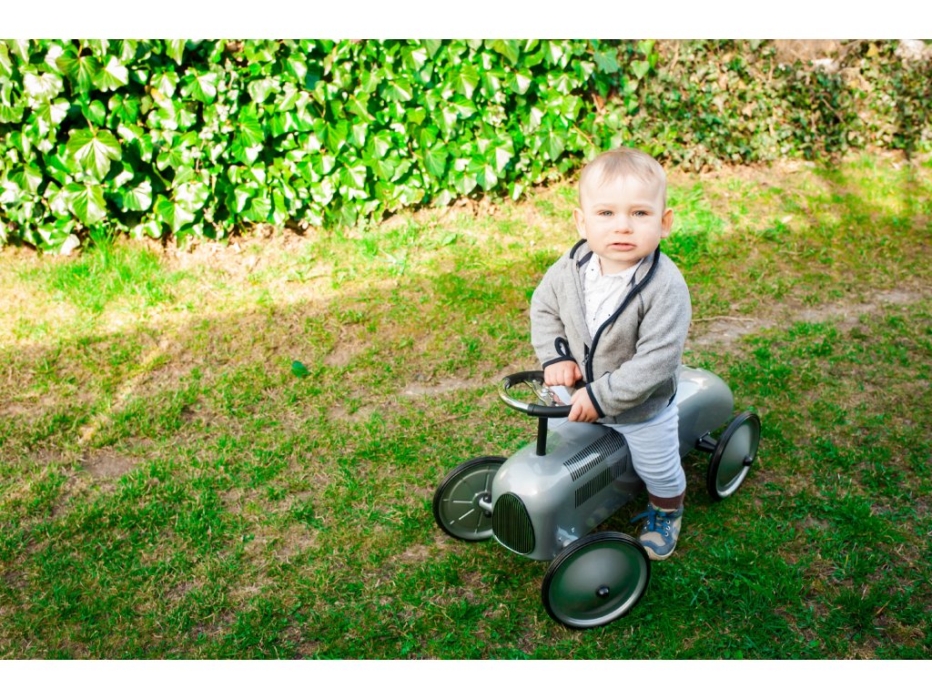 Moderní odstrkovadlo, které svým vzhledem připomíná závodní auta. Má malovaný chladič, gumová kolečka a tvarované plastové sedátko. Dítě se díky volantu naučí koordinaci rukou a nohou. Odrážedla mají velký význam při prvních krůčcích, naučení rovnováhy. Pastelové barvy nebudou rušit žádný pokojíček. Stříbrná barva se hodí pro kluky i holčičky. Nakupte svým dětem tato krásná originální odrážedla, pak už stačí vyjet na závodní dráhu a můžete mít doma malého mistra světa. Luxusní plechová hračka, která vydrží po generace a nikdy neomrzí. A když zrovna děti nejezdí, stává se z ní skvělý designový doplněk, který v moderním pokojíčku nesmí chybět.
