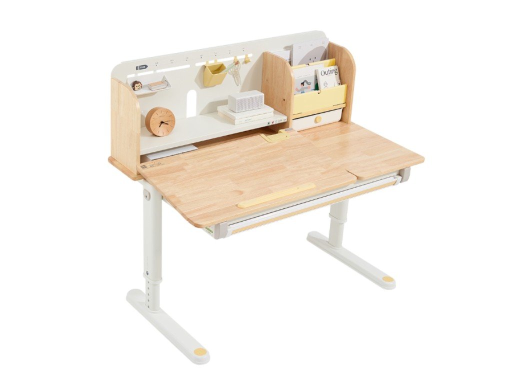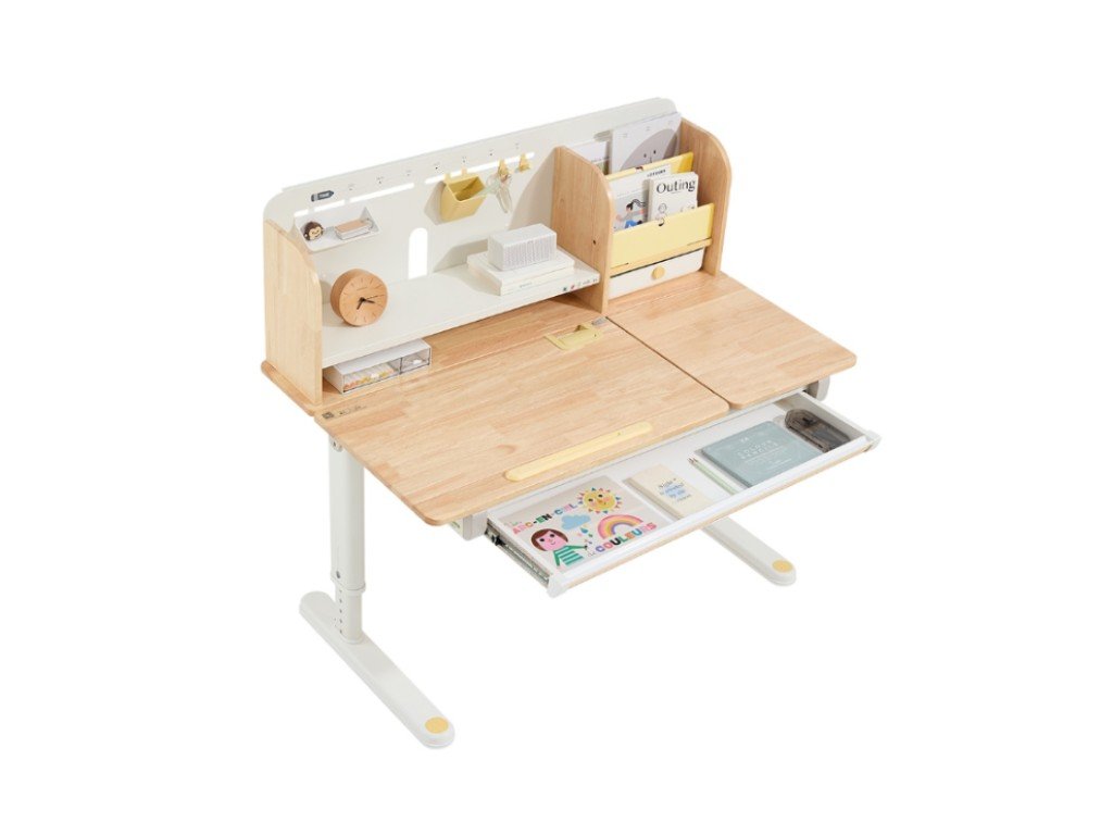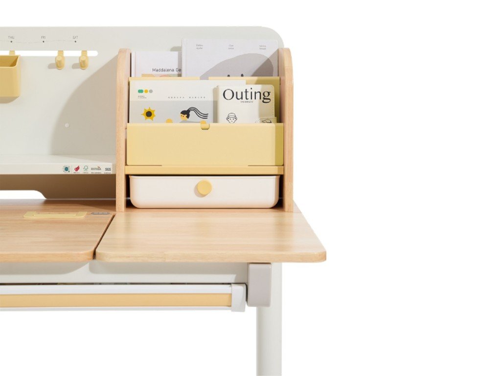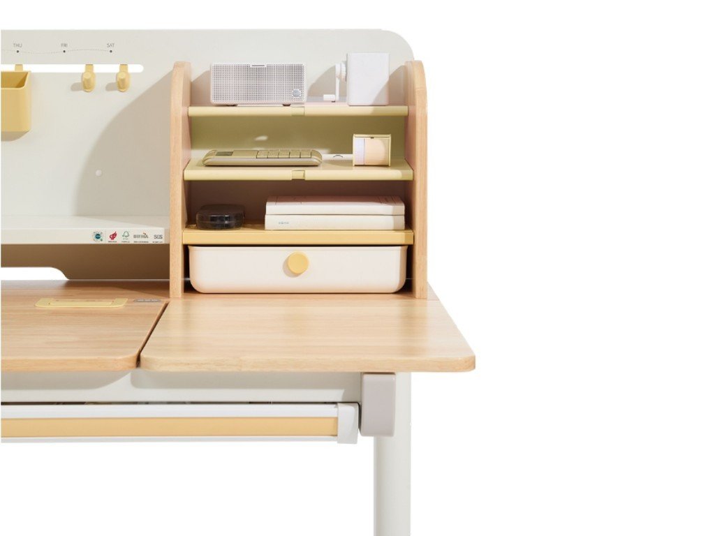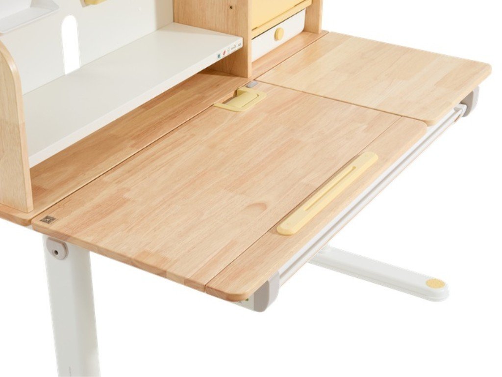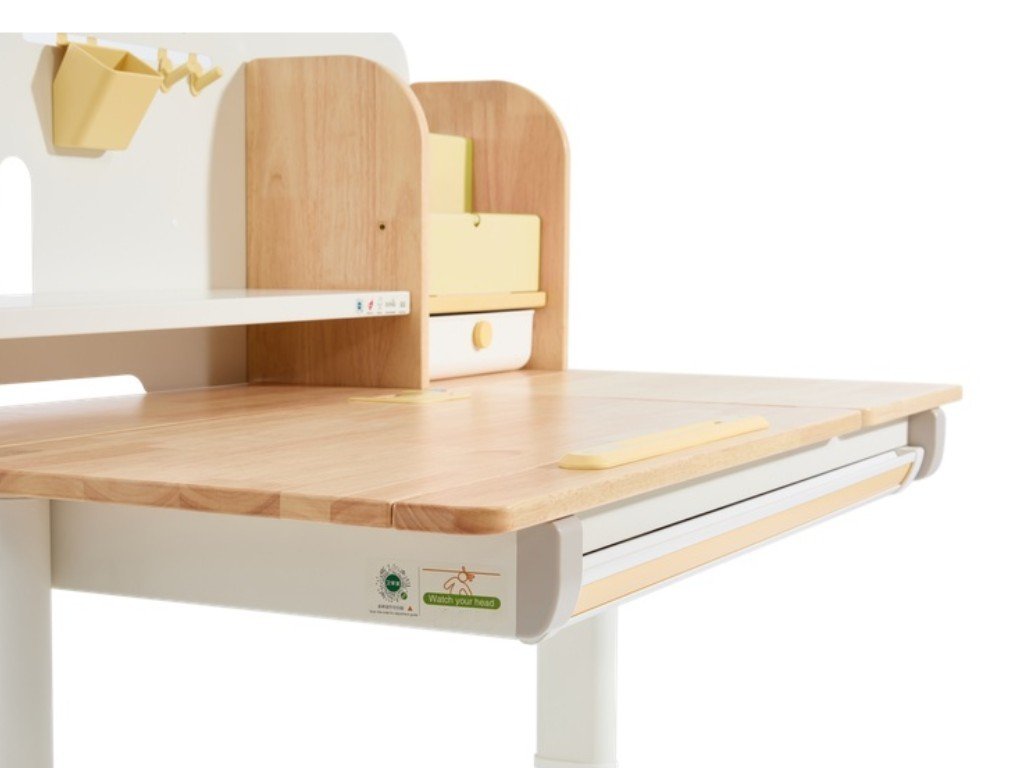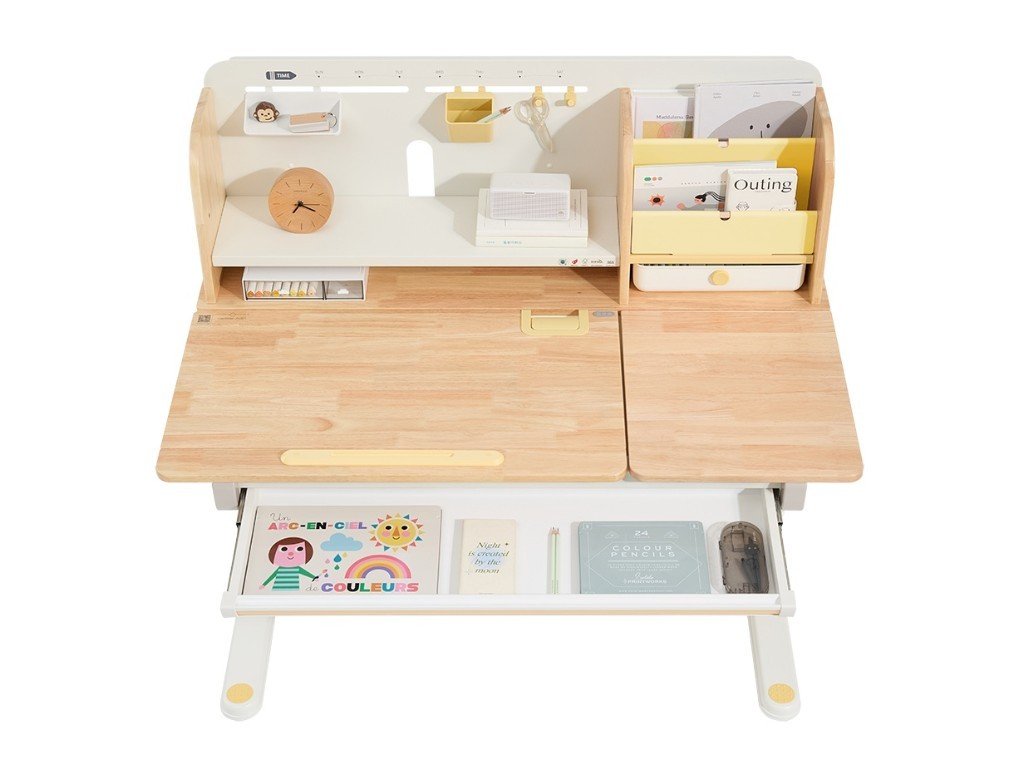 Kvalitní psací stůl v ergonomickém designu nedomyslitelně patří do dětského pokoje. Dětský psací stůl v kombinaci přírodního dřeva s bílou a žlutou barvou, s policemi a zásuvkami, s velkou pracovní plochou, umožní dětem kreslit si, psát, učit se i tvořit a při tom mít maximální pohodlí a komfort. Díky rostoucí funkci - možnosti nastavení výšky pracovní desky tento stůl doslova poroste s vašim dítětem. Výšku můžete nastavit jednoduše a rychle, ručně. Děti tak mohou u stolu nejen seděti, ale i stát. Část desky stolu je navíc sklopná, takže například kreslení nebo čtení bude velice pohodlné. Přímo pod deskou stolu se ukrývá velká zásuvka na školní, psací nebo výtvarné potřeby. Z dalších úložných prostorů nad deskou stolu - polic a šuplíku, budou děti nadšené. Přímo vybízí k vystavení oblíbené knihy, rodinné fotografie, talismanů, pokladů a všeho, co se do zásuvek nevešlo. Kvalitní materiály zaručují vysokou stabilitu, odolnost i životnost. Psací stůl bude vaše dítko provázet dětstvím, předškolní přípravou a obdobím studií na základní i střední škole.