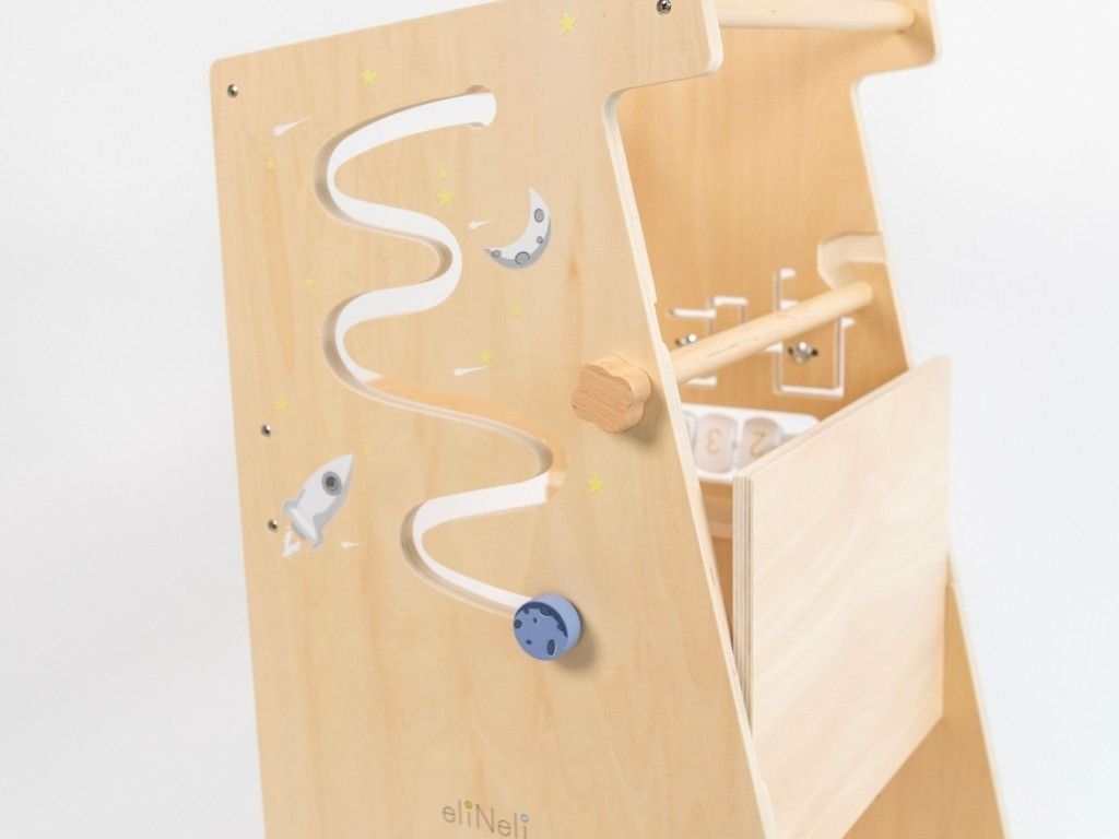Tento všestranný pomocník se snadno přemění v dětský stoleček se židličkou, u kterého mohou děti tvořit i posvačit. Stačí rostoucí učící věž položit zadní stranou na podlahu a přesunout plošinu, na které děti v učící věži stojí. Plošina poslouží jako deska stolu. Obě bočnice učící věže, se svými 4 hracími prvky, přináší dětem zábavu i možnost vzdělávání. Na jedné straně děti najdou parádní kuličkovou dráhu, na druhé straně pak kreslící tabuli, bludiště i otočné destičky s číslicemi.