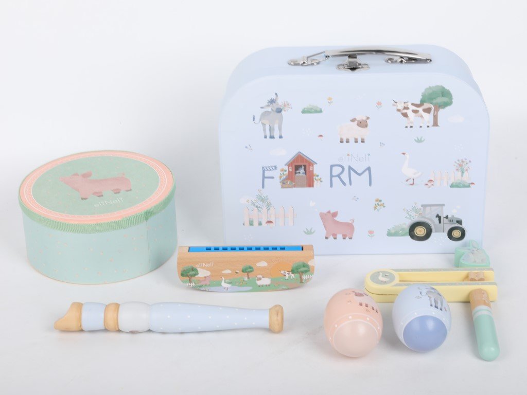 Sada dětských hudebních nástrojů okouzlí svými designem, barvami a roztomilým motivem děti i dospělé. Hudební nástroje v jemných pastelových barvách, zdobené zvířátky z farmy, v jejich skutečné, reálné podobě probudí lásku k hudbě v každém dítěti. Nafrněné prasátko naučí děti bubnovat, králíček s husou dělat pořádný hluk s hrkačkou, koník hrát na flétnu, oslík s ovečkou rozezvučet hudební (zvuková) vajíčka a všichni dohromady hrát na foukací harmoniku. S dětskými hudebními nástroji si děti mohou zahrát na opravdové muzikanty a spolu s kamarády založit hudební kapelu, jejíž členy se samozřejmě mohou stát i rodiče.