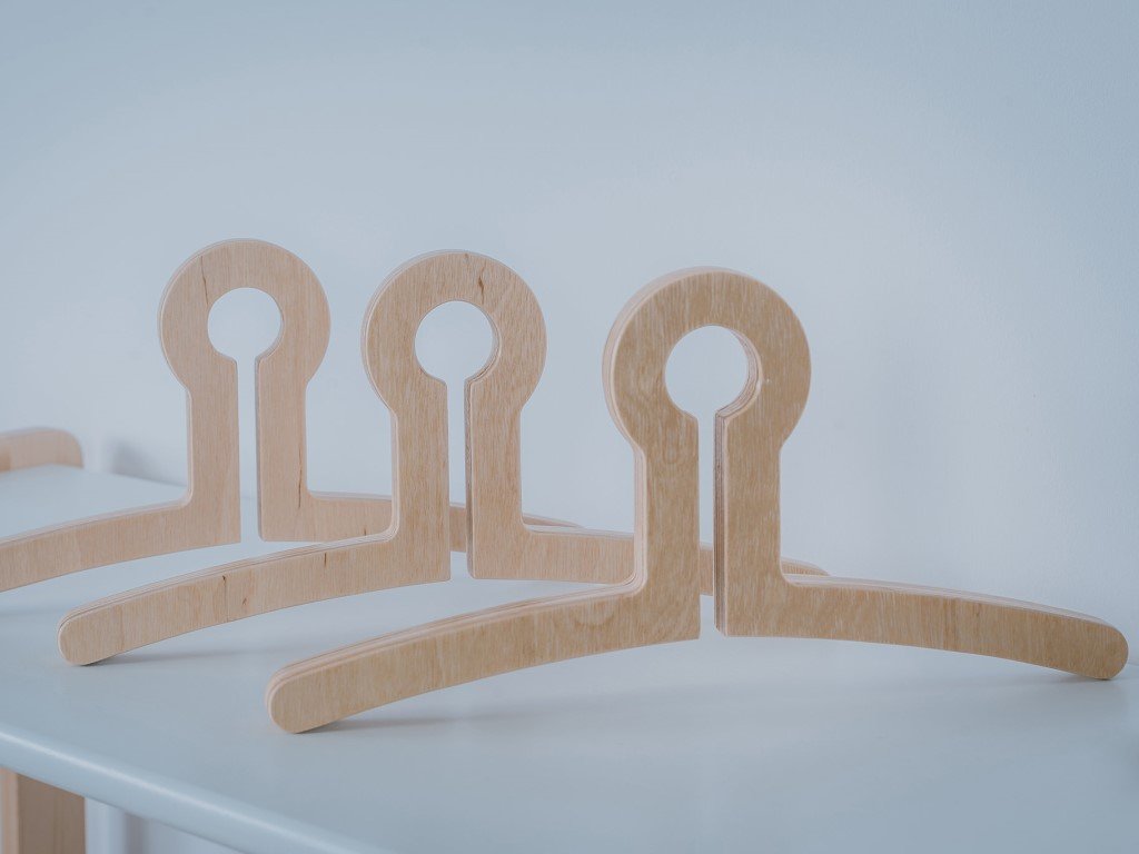 Set dřevěných ramínek je doplňkem k dětskému dřevěnému stojanu na oblečení s policí a výřezem nebo dětskému dřevěnému stojanu na oblečení s policí a šatní tyčí.