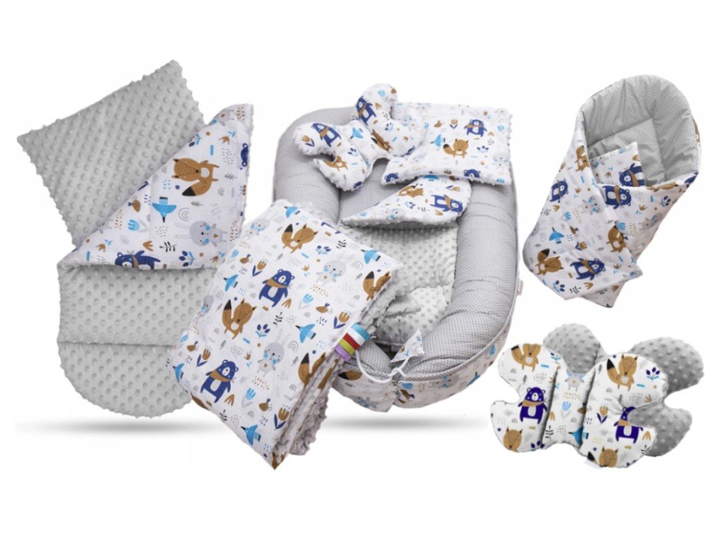 - 7dílný set obsahuje: 1 oboustranné dětské hnízdečko, 1 oboustrannou zavinovačku, 1 oboustranný tvarovaný polštářek ve tvaru motýla, 1 oboustranný plochý polštářek, 1 oboustrannou přikrývku, 1 oboustrannou podložku, 1 bavlněnou tašku (pytel).