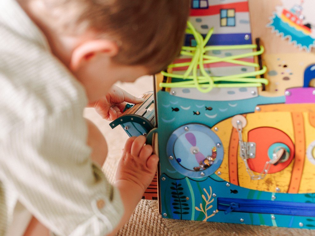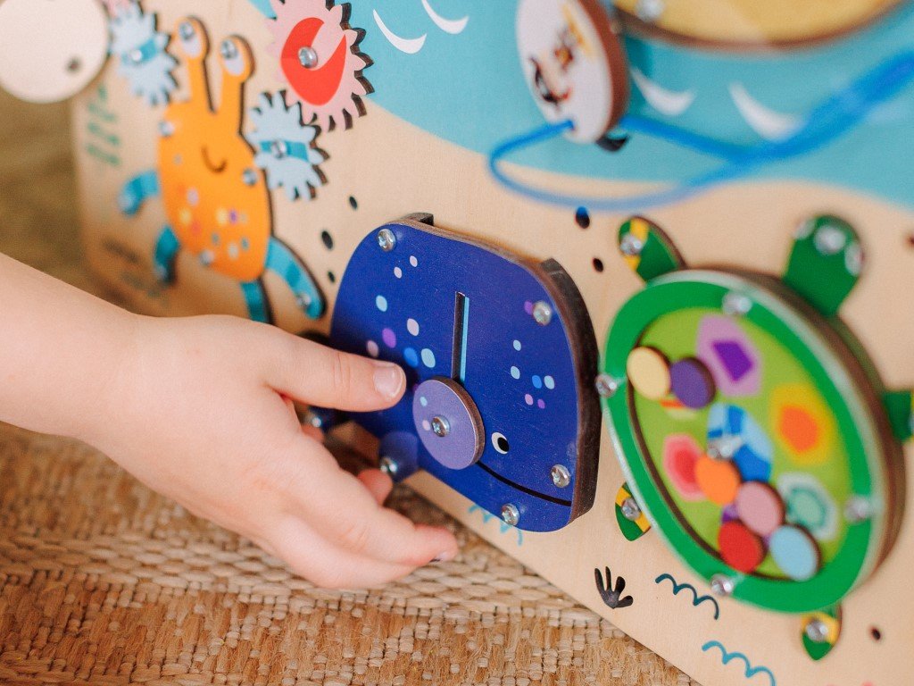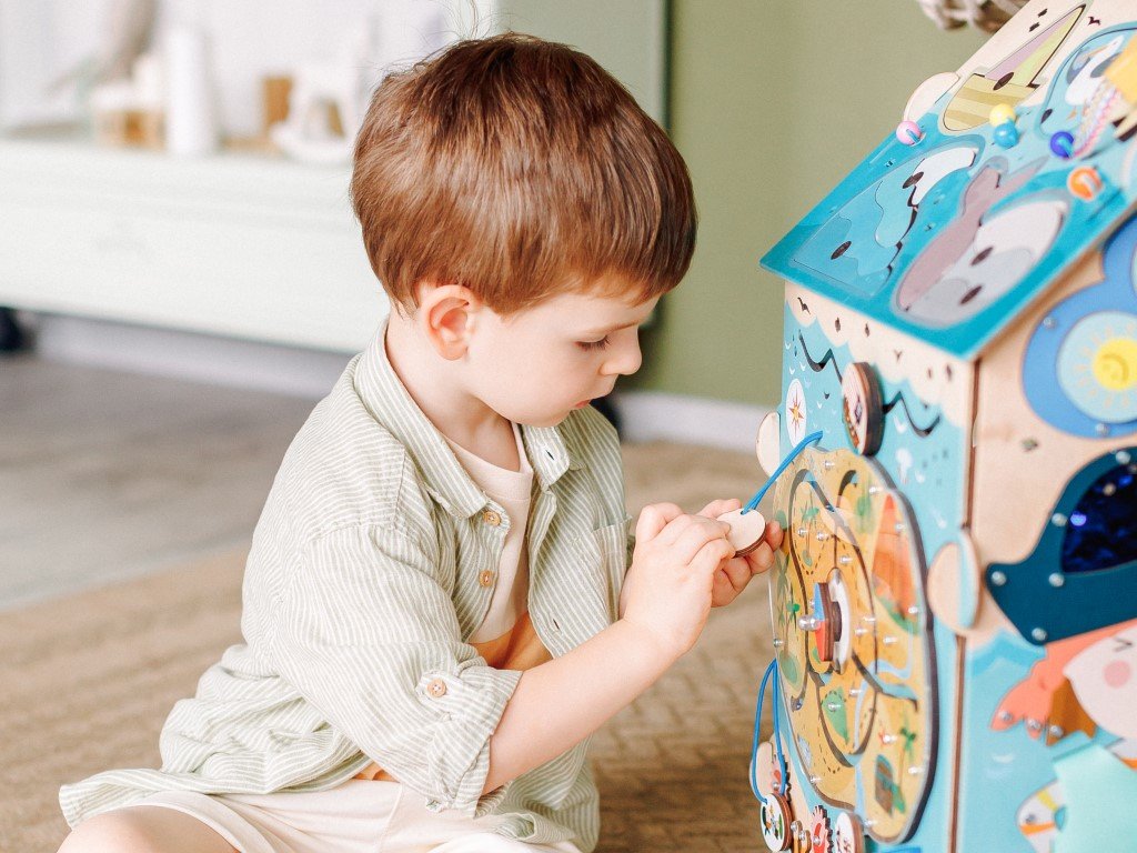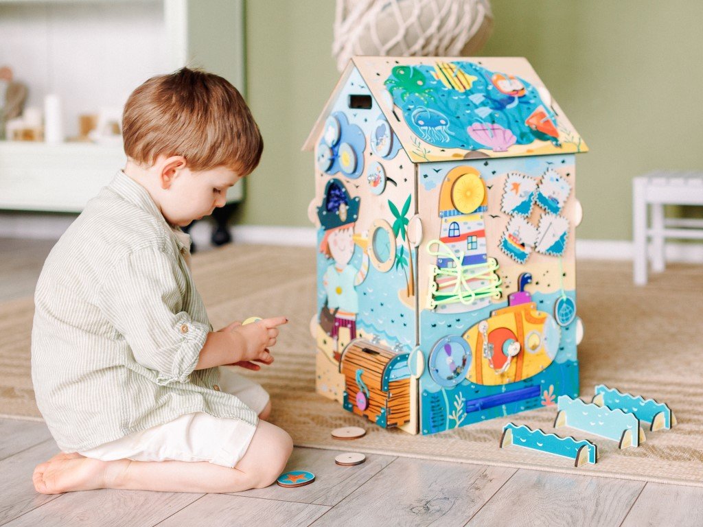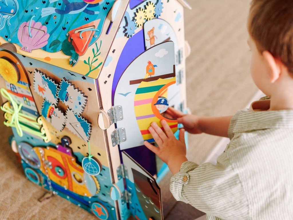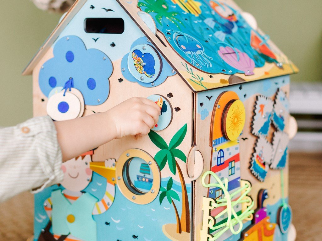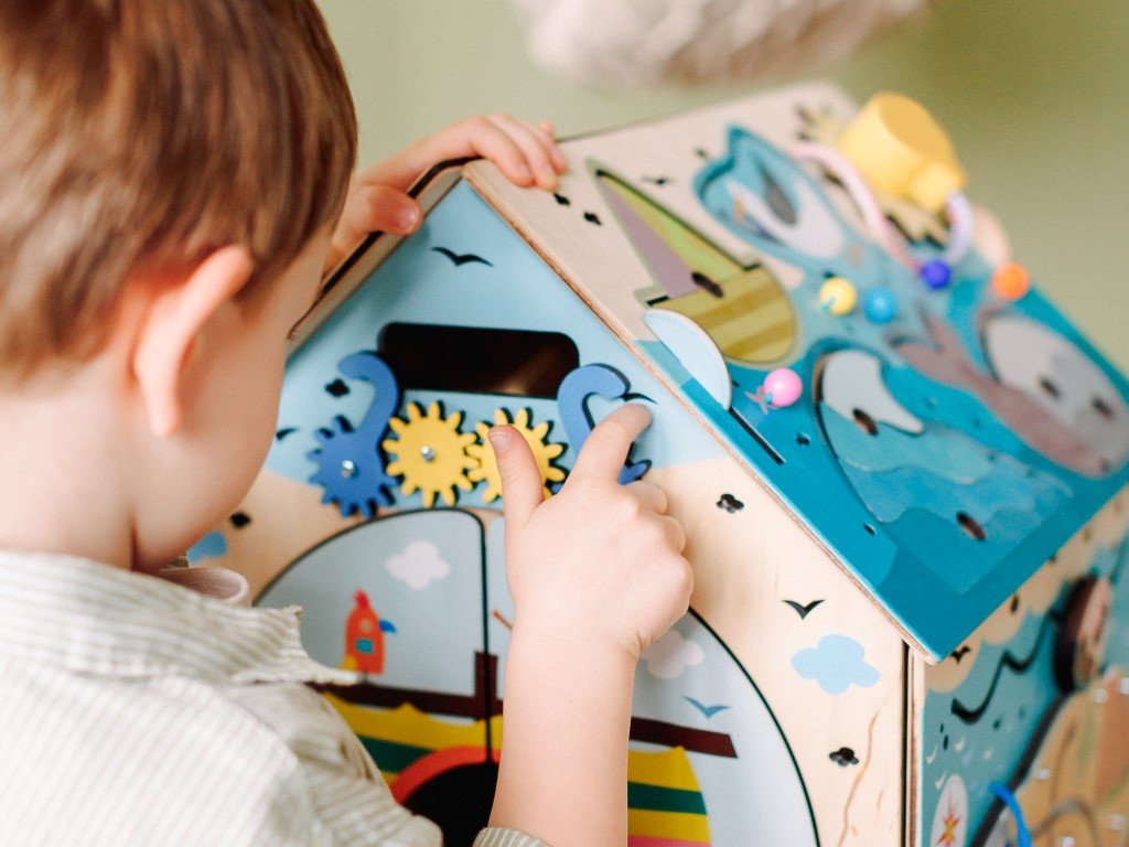 Montessori prvky na activity board domečku umožňují dětem všestranně se rozvíjet díky své přirozené zvídavosti.