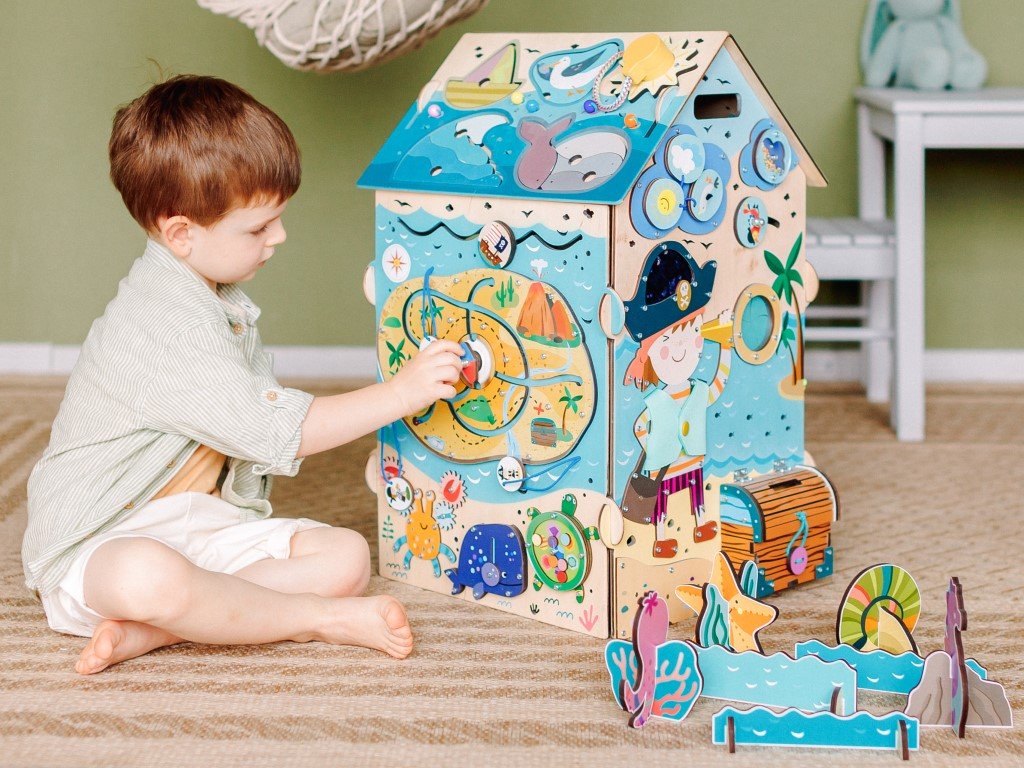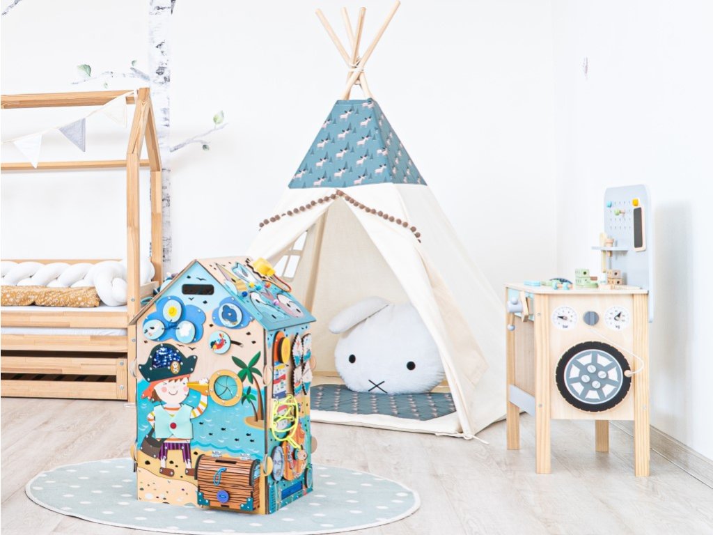 Activity board domeček Pirát je složený ze šesti desek s hracími a montessori prvky zaměřenými na zručnost, logiku, kreativitu a trpělivost. Domeček vtáhne děti do světa objevování a fantazie, kde si děti samy hrají a učí se tím nejpřirozenějším způsobem, pomocí hry.