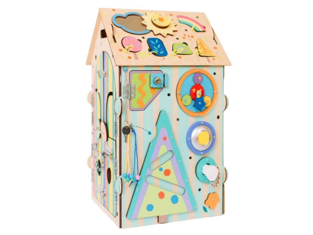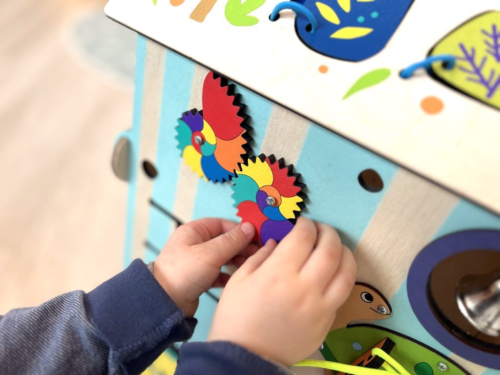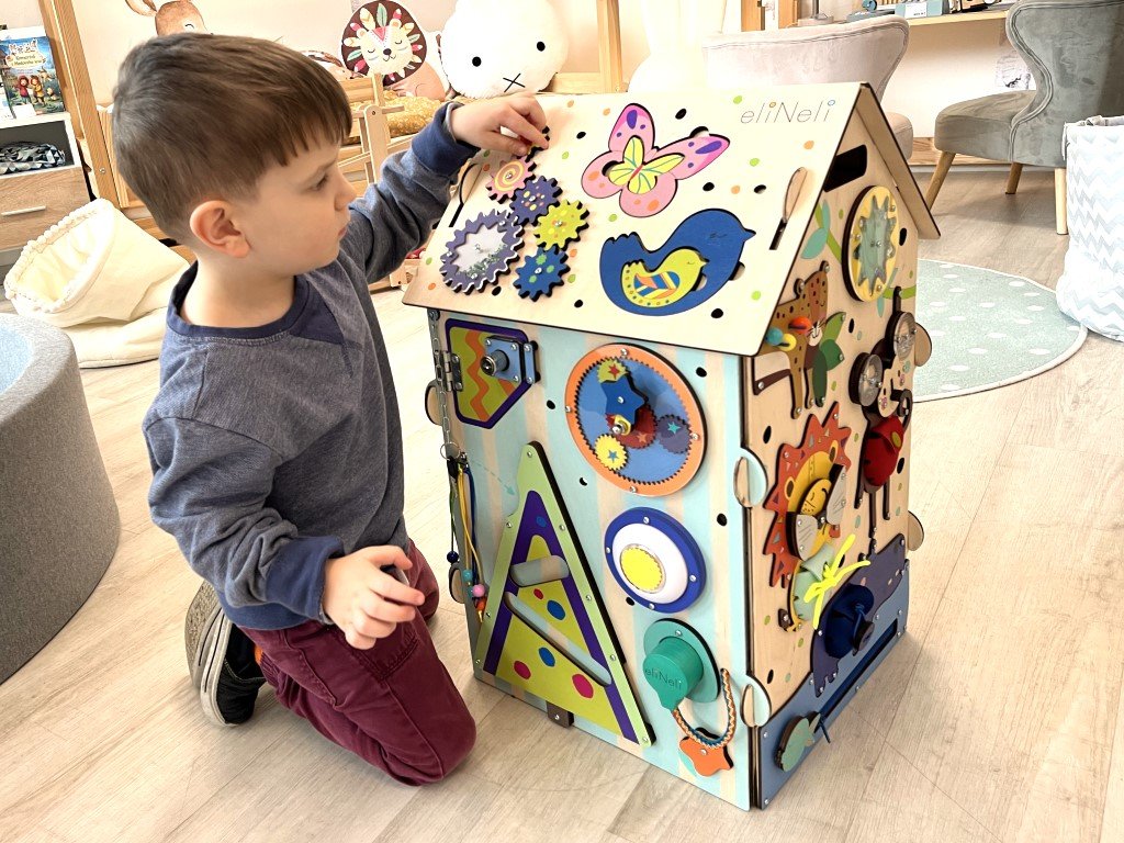 Montessori prvky na activity board domečku umožňují dětem všestranně se rozvíjet díky své přirozené zvídavosti.