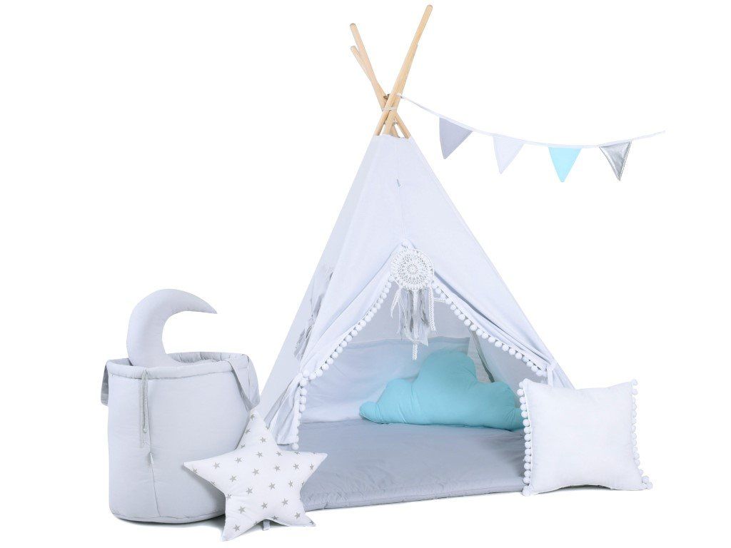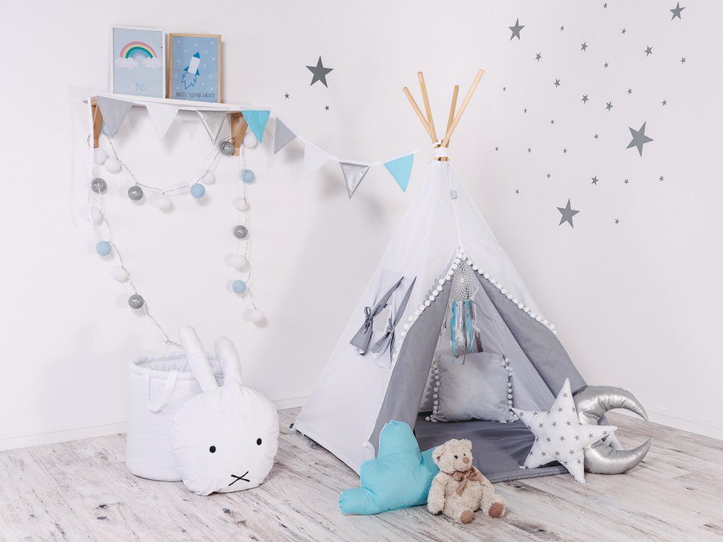 teepee stan do dětského pokoje girlanda, koš na hračky, podložka na zem