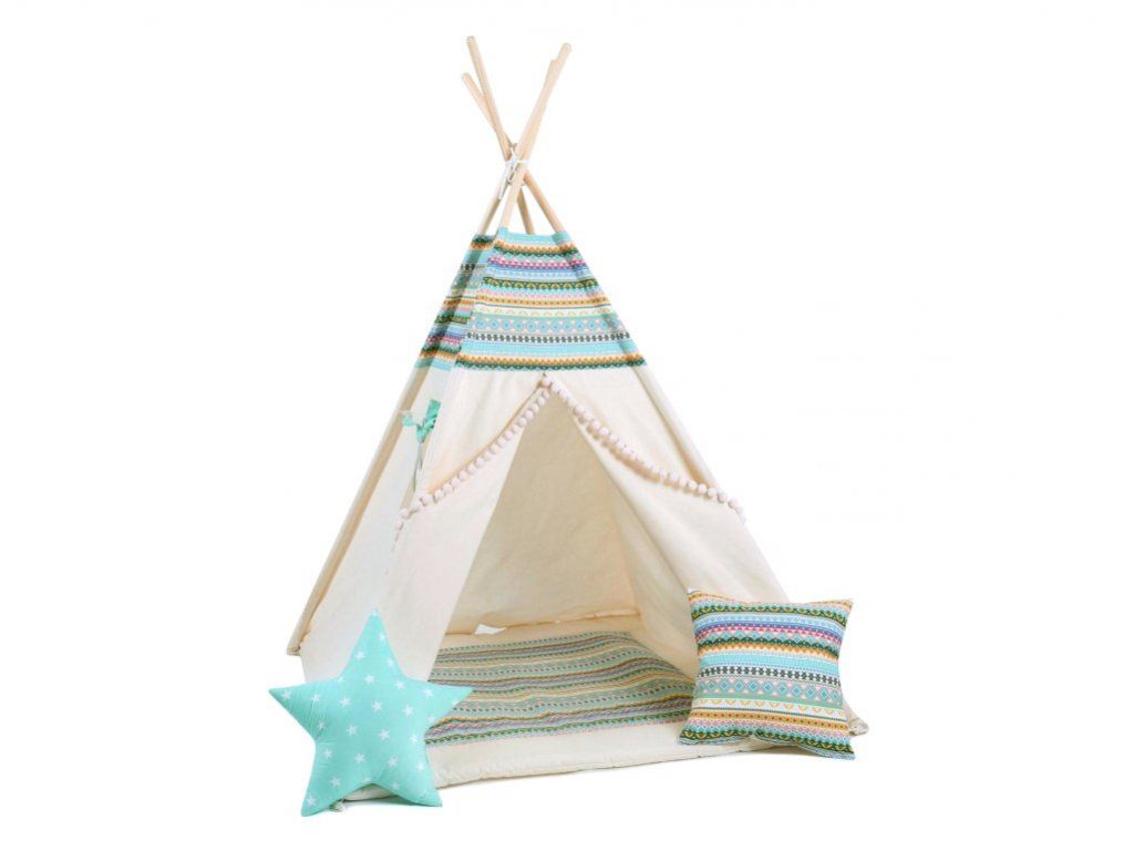 Konstrukce teepee byla velmi jednoducha, vse se vyborne uchytilo tkanickami. Syn je nadseny zvlast z maleho okenka.