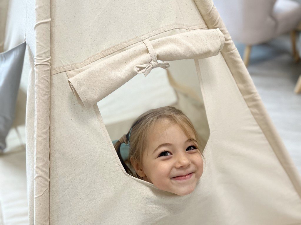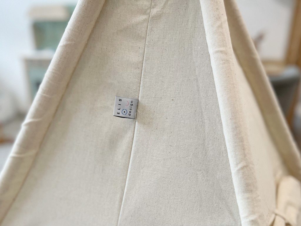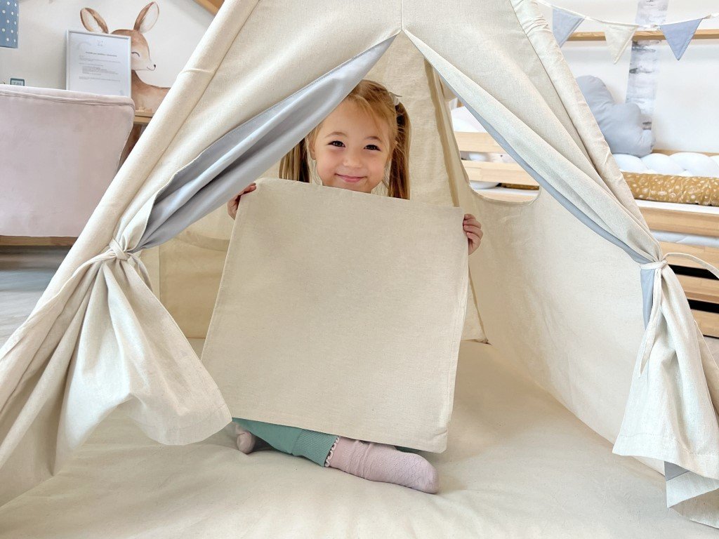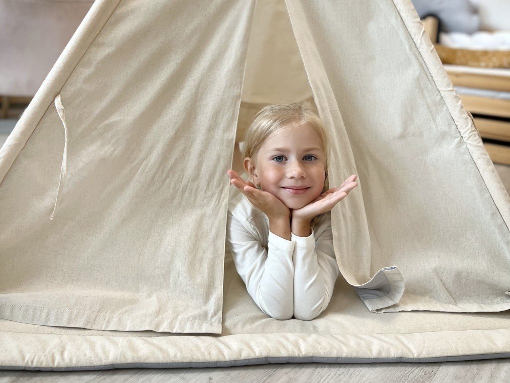 Krémový teepee stan můžete doplnit košem na hračky nebo dětským polštářkem, který díky neutrálnímu barevnému provedení týpí snadno vzájemně sladíte.