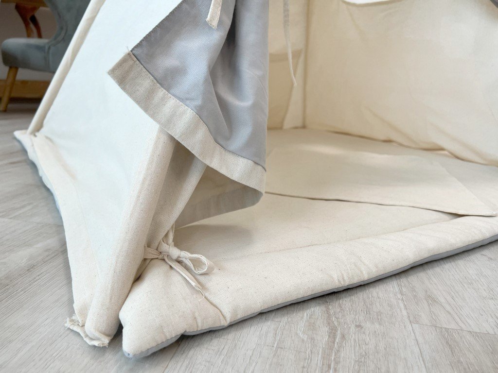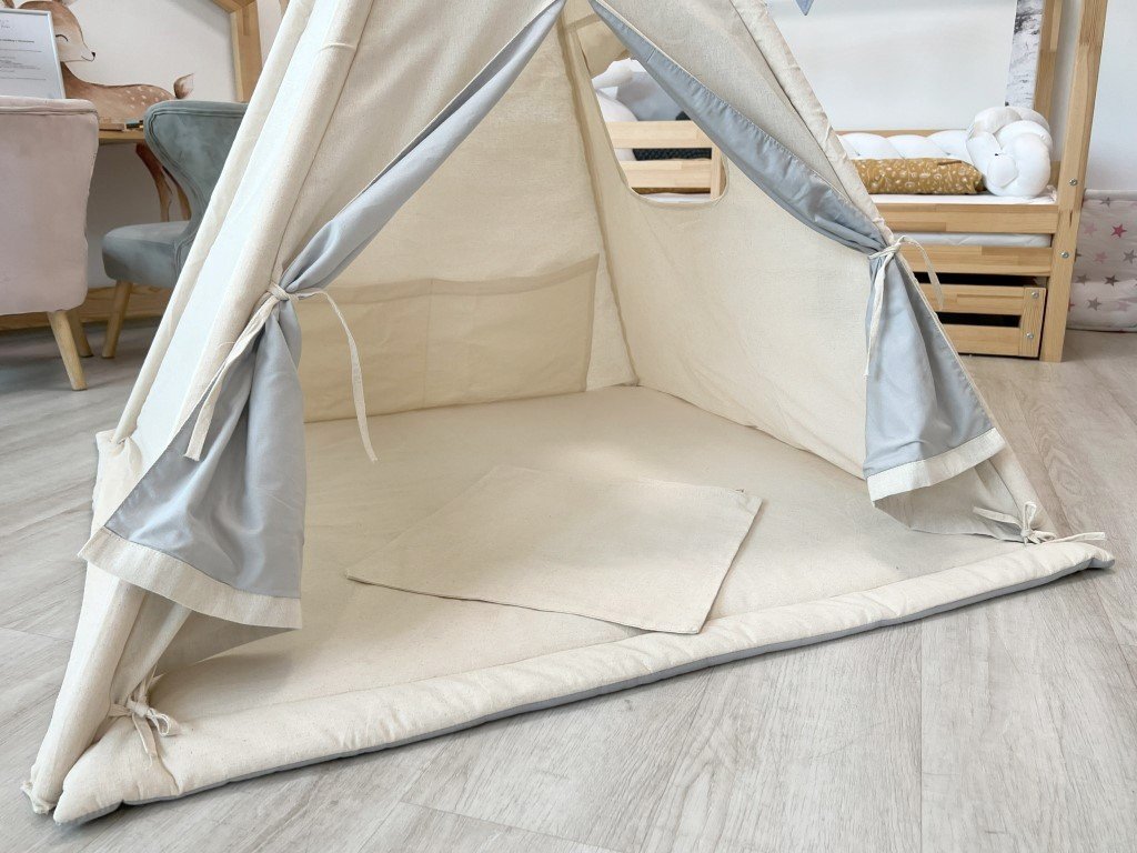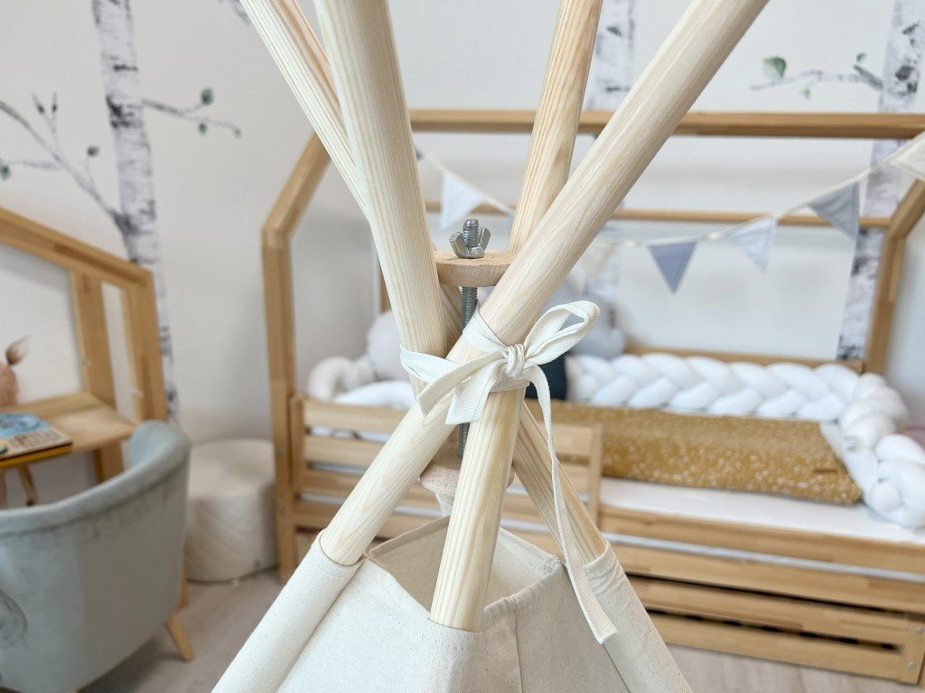 Dětský teepee stan je jedním z nejoblíbenějších obydlí do dětského pokoje. Je krásným a prodyšným domečkem, do kterého se děti mohou schovat a nerušeně si hrát i odpočívat, skrýší i místem pro dobrodružné hry. Týpí stan nabízí spoustu možností ke hře pro jednotlivce i skupinku dětí. Jako správný domeček má i toto dětské obydlí okýnko a prostorný vchod, pohodlí dětem dopřeje měkká podložka barevně sladěná s teepee stanem. Uvnitř týpí nechybí kapsičky pro uložení oblíbených hraček, knihy nebo dětských pokladů. Součástí týpí je i potah na polštář. Dětské teepee v neutrální krémové barvě snadno sladíte s ostatním vybavení v pokojíčku a je vhodný jak pro holčičky, tak pro chlapce. Dětské teepee je vyrobené z jemné a prodyšné látky, z přírodního dřeva, ze zdravotně nezávadných materiálů. Pro větší stabilitu a lepší vypnutí je týpí doplněno stabilizačním systémem - fixátorem tyčí.