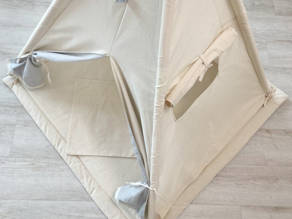 - Balení obsahuje: teepee stan, měkkou podložku, potah na polštář, dřevěné tyče, fixátor tyčí (stabilizační systém).