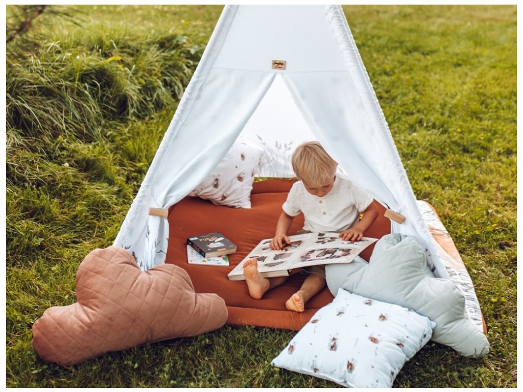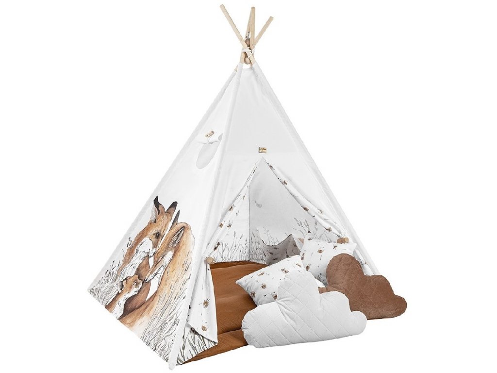 Barevně neutrální teepee stan světlé barvy s krásným vyobrazením liščí rodinky, jejíž členové se k sobě něžně tulí ve vysoké trávě, se stane ozdobou každého holčičího i klučičího pokojíčku. V týpí si vaše děti mohou vytvořit skrýš, své vlastní liščí doupě, kde si mohou nerušeně hrát, číst si knihu nebo odpočívat. Určitě vás budou i přemlouvat, aby v něm mohli přespat. Týpí je dostatečně velké. Vaše dítě si v něm může hrát samo, ale i s vámi nebo svými kamarády. Kulatými okénky mohou děti sledovat okolí svého úkrytu, do dvou velkých kapes uvnitř stanu ukrýt své oblíbené hračky nebo poklady. Teepee stan je vhodný do interiéru i exteriéru.