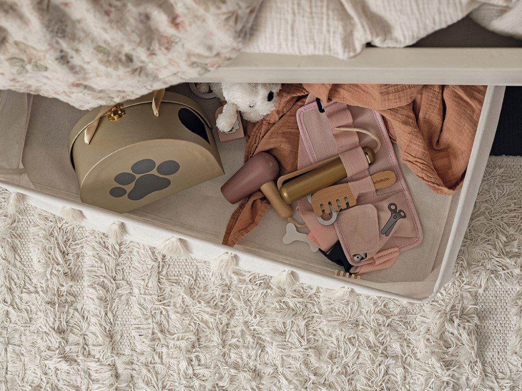 Úložný box na hračky, oblečení nebo lůžkoviny, určený k zasunutí pod postel, usnadní vám i vašim dětem úklid dětského pokoje. Látkový box v neutrální bílé barvě schová vše co je potřeba a pod postelí bude svými ozdobnými střapci na jedné ze stran zdobit pokojíček. Snadno přístupný úložný prostor vede děti k samostatnosti v úklidu a promění tuto činnost v zábavu. Co třeba uspořádat závody, kdo večer před spaním uklidí více hraček?