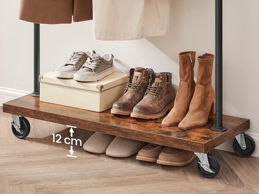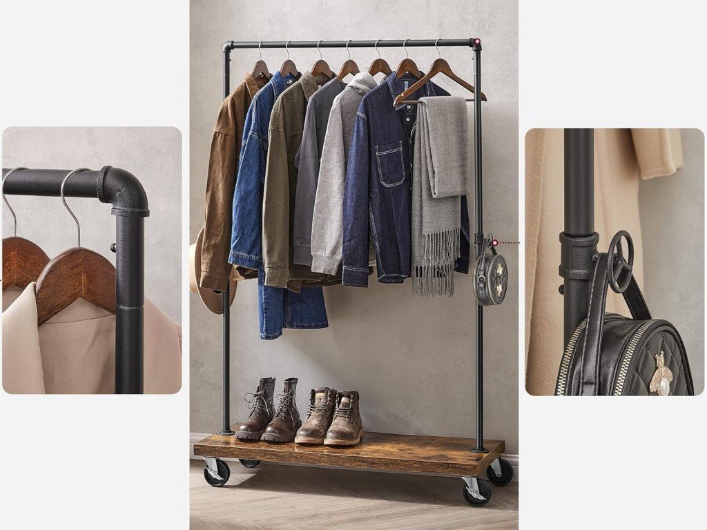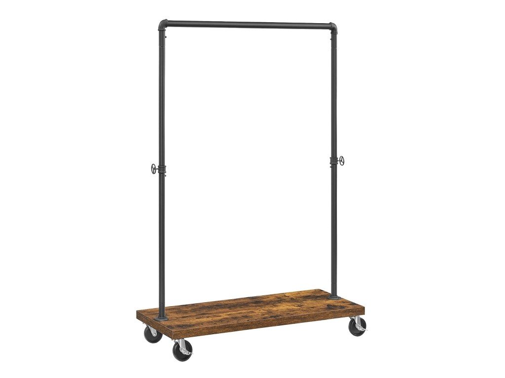 Věšák nebo stojan na oblečení v jedinečném industriálním stylu je praktickým pomocníkem při úklidu oblečení, při oblékání i dekorací do interiéru. Šatní tyč vyrobená z pevných ocelových trubek unese až 90 kg a nabízí spoustu místa pro zavěšení ramínek s šaty, košilemi, bundami, kabáty. Na polici ve spodní části, s nosností 25 kg, můžete umístit úložné boxy, obuv, hračky i hry. Díky kolečkům je věšák na oblečení pojízdný, snadno se přesouvá a snadno se s ním manipuluje. Proti pohybu jej zajistíte pomocí brzd na 2 ze 4 koleček. Originální věšák si své místo najde na chodbě, v hale, šatně, dětském pokoji, ložnici, v moderním interiéru i na chalupě.