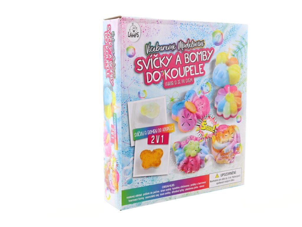 Balení obsahuje vše potřebné: voskový základ, prášek do pečiva, síran sodný, kyselinu citrónovou, barvivo, tvarovací formy, esenciální olej, knot, dřevěné tyčky, jehlu a návod.